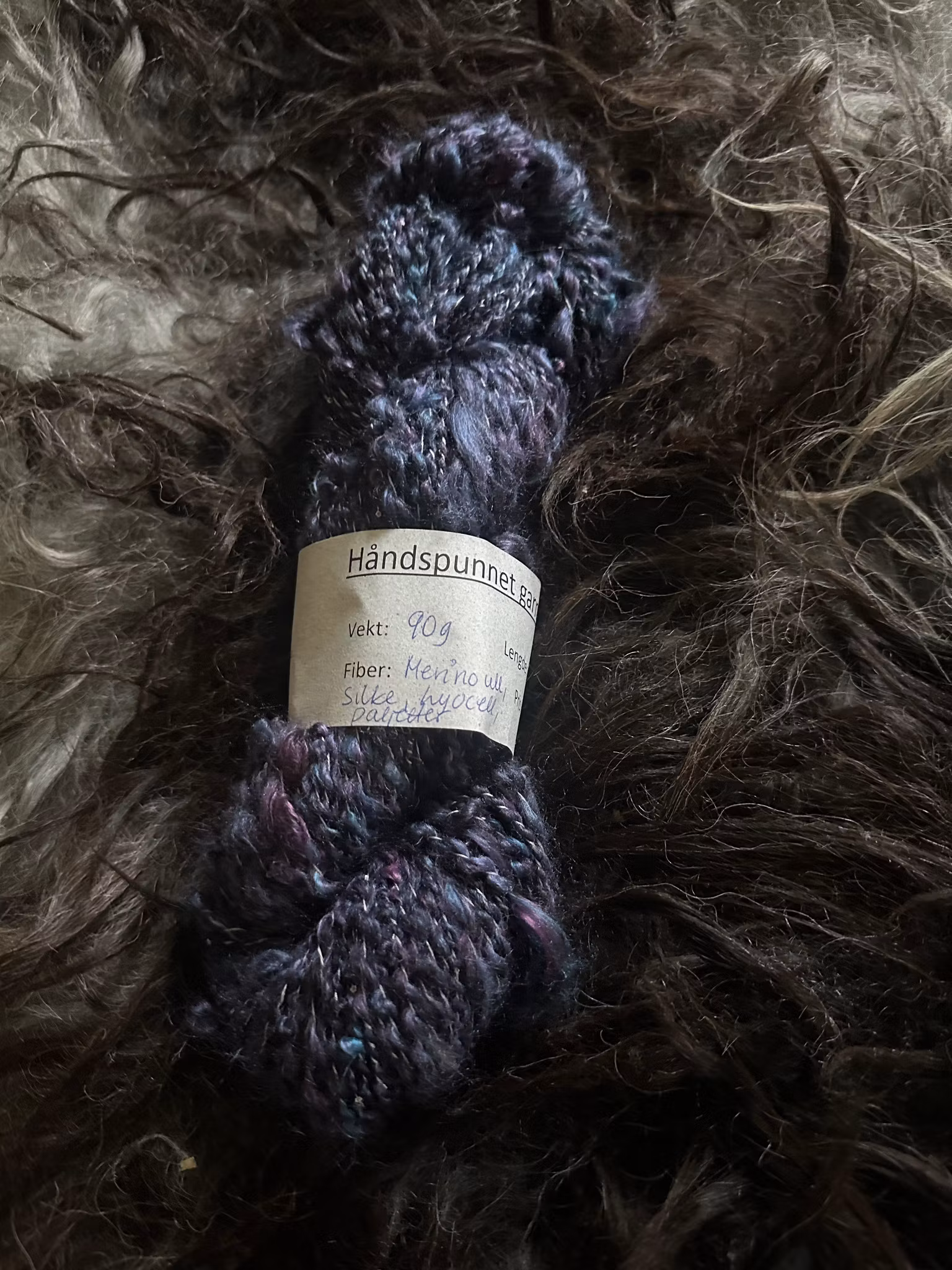 Håndspunnet effektgarn der en tråd merino/silke er tvunnet med en lyocellgarn med paljetter. Garnet har boucléeffekt, er mykt og glansfullt, og har mye struktur. Supermykt og deilig. 90 gram, 120 meter.