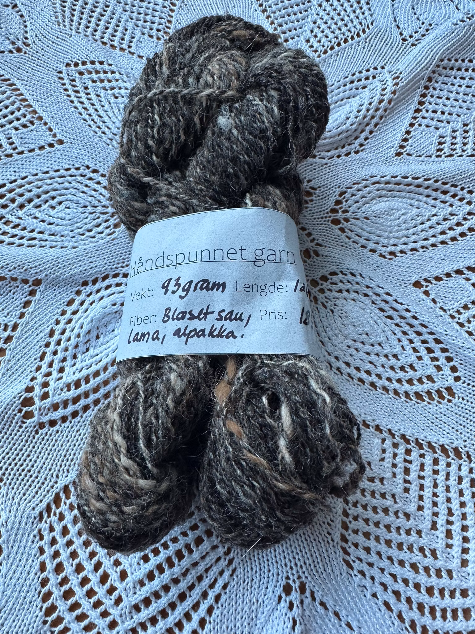 Håndspunnet garn 185,- Håndspunnet garn av blæset sau, lama og alpakka. To hesper som tilsammen veier 93 gram og måler 126 meter. På lager. Legg i handlekurv Del Lagerbalanse: 1 Artikkelnummer: 455 Informasjon Tilbakemeldinger Håndspunnet garn av blæset sau, lama og alpakka. To hesper som tilsammen veier 93 gram og måler 126 meter.