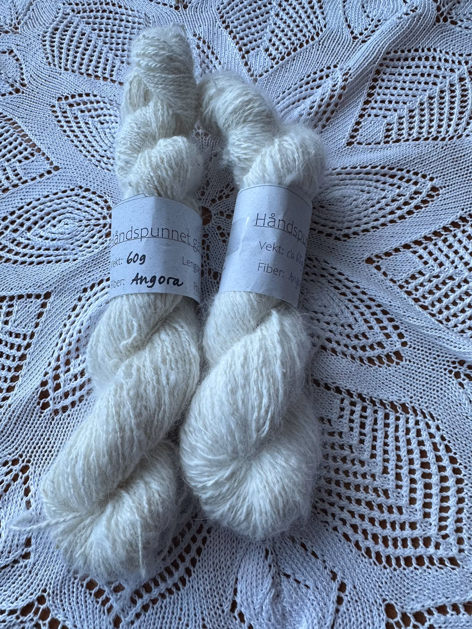 Håndspunnet angoragarn 360,- Håndspunnet garn av 100% angora fra egne dyr. 60 gram, 100 meter. Produktet finnes dessverre ikke i lager. Del Lagerbalanse: Artikkelnummer: 463 Informasjon Tilbakemeldinger Håndspunnet garn av 100% angora fra egne dyr. 60 gram, 100 meter.