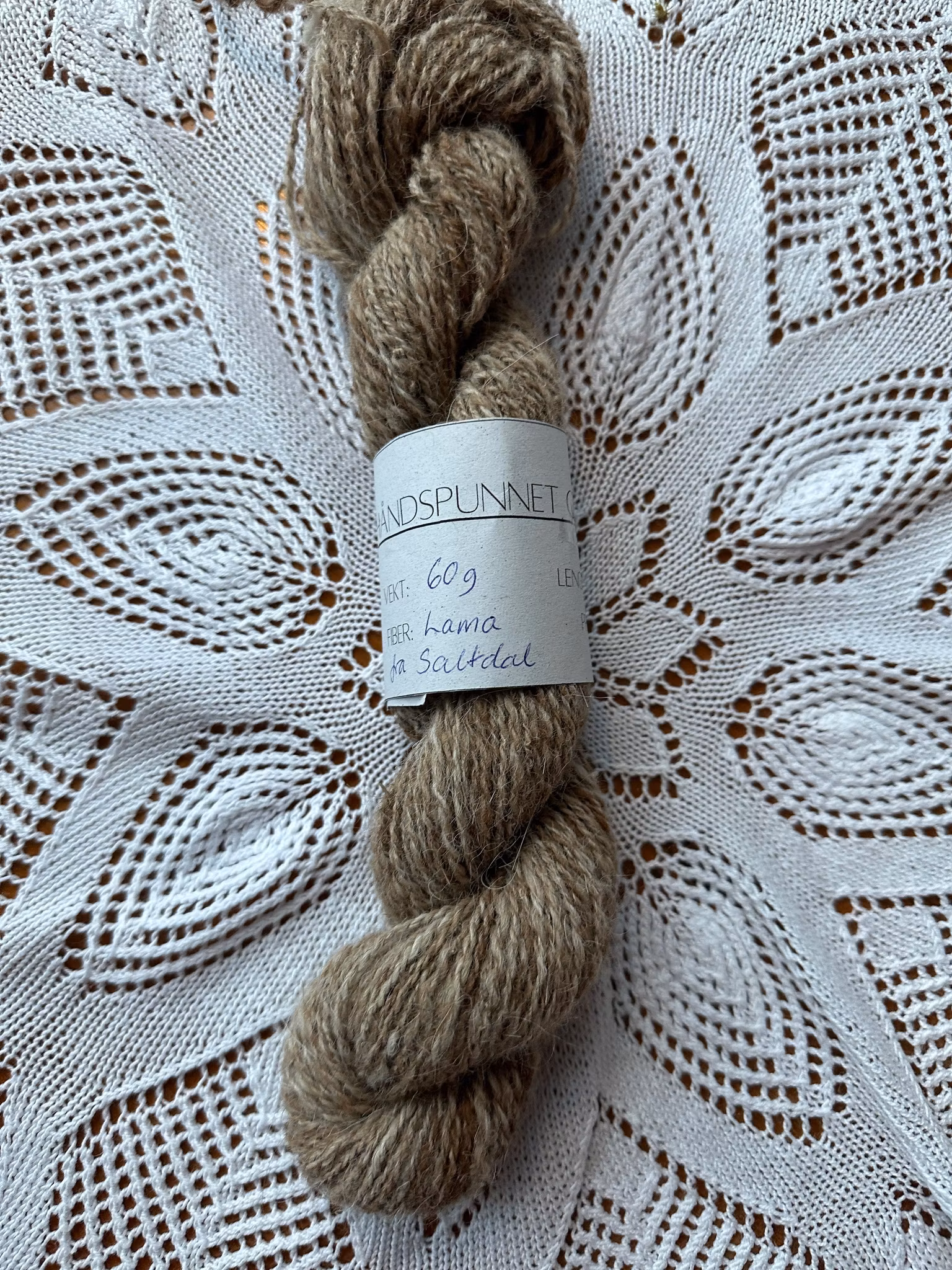 Håndspunnet garn av lama fra Saltdal. Inneholder naturlig en del dekkhår, men garnet mykner i bruk og kan toves. Forskjellig vekt og lengde på hespene: