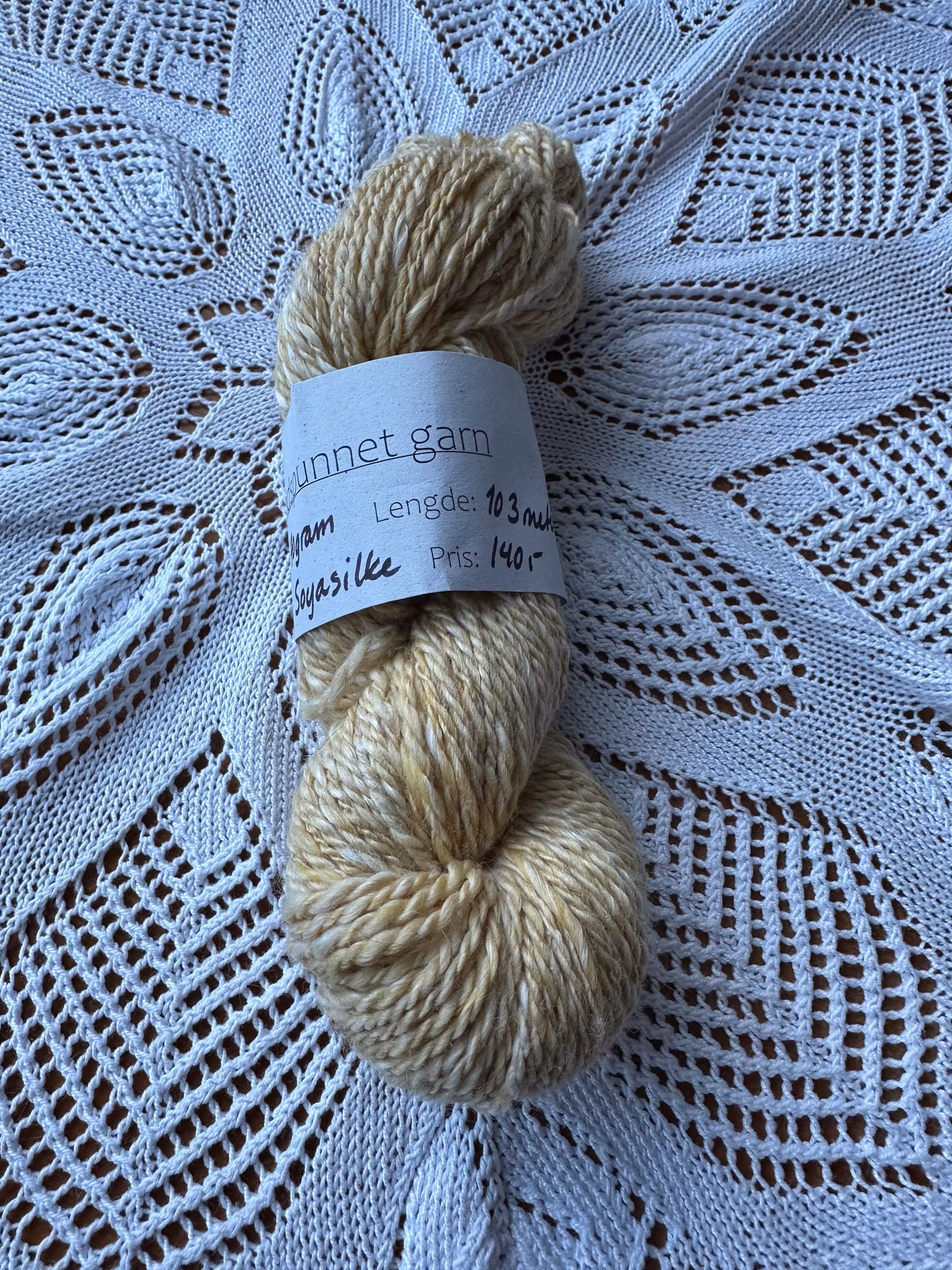 Håndspunnet soyasilke 140,- Håndspunnet garn av soyasilke. 70 gram, 103 meter. På lager. Legg i handlekurv Del Lagerbalanse: 1 Artikkelnummer: 458 Informasjon Tilbakemeldinger Håndspunnet garn av soyasilke. 70 gram, 103 meter.