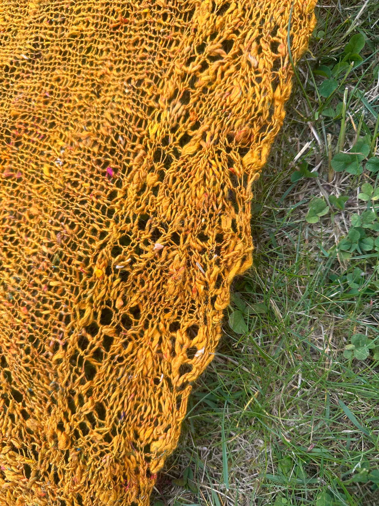Nydelig rustikt, glansfullt og mykt sjal med blondekant. Dette er strikket i håndspunnet garn av resirkulert sarisilke, som gir garnet glans og spennende strukt