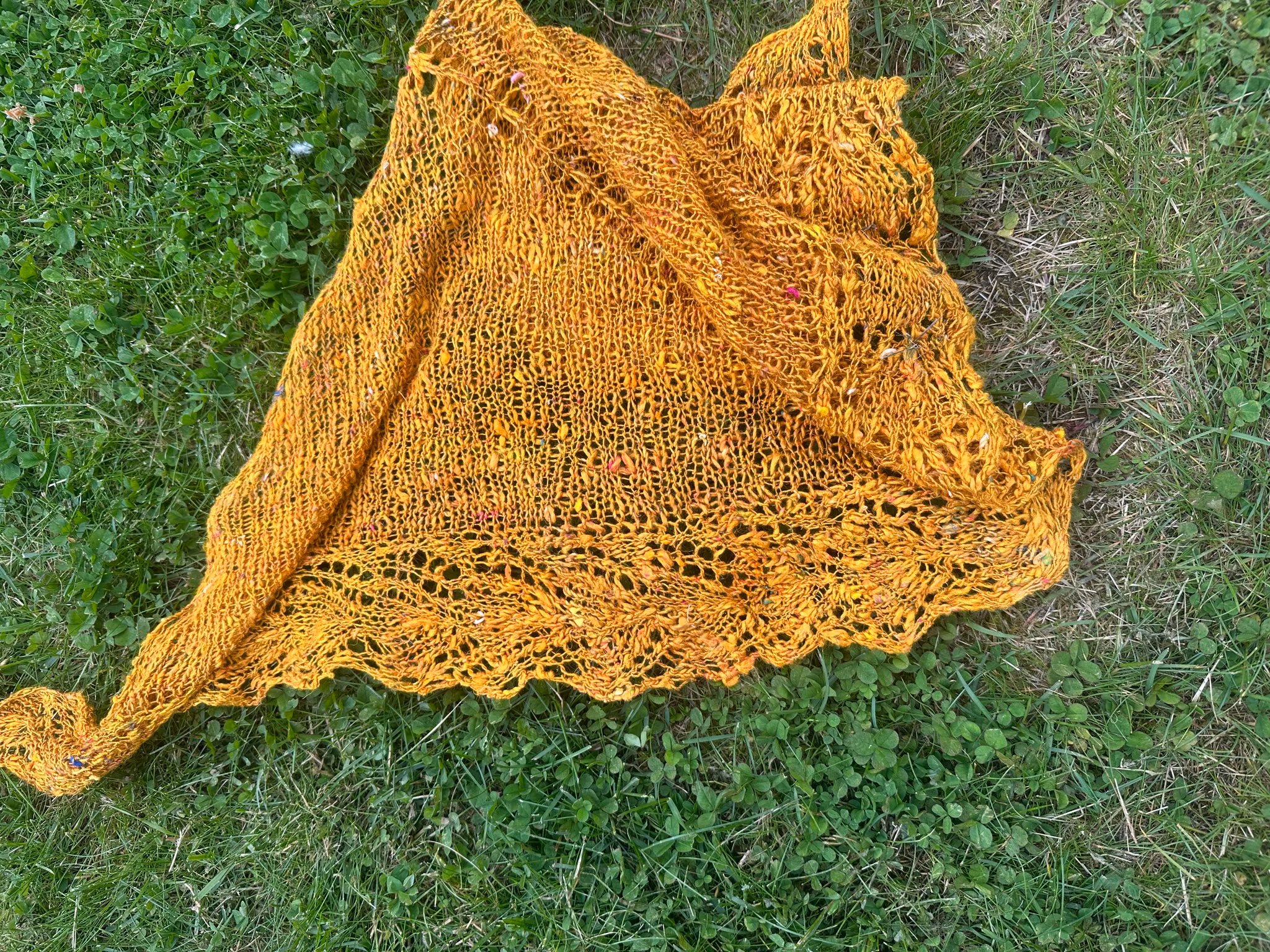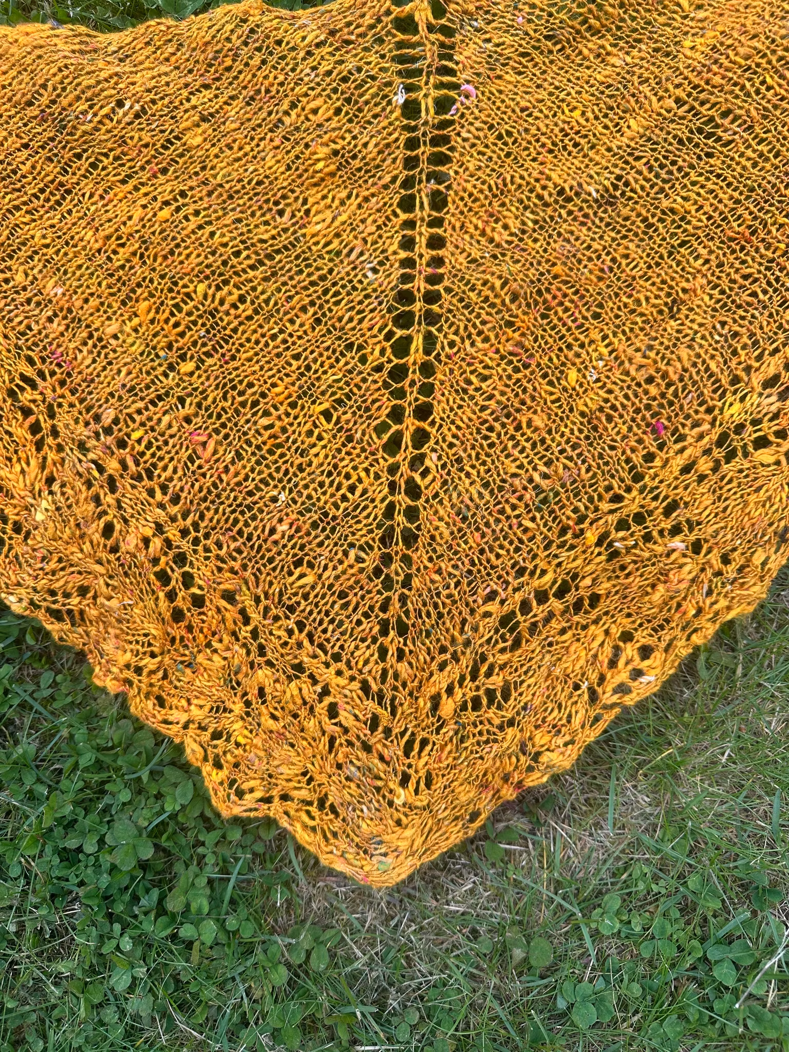 Nydelig rustikt, glansfullt og mykt sjal med blondekant. Dette er strikket i håndspunnet garn av resirkulert sarisilke, som gir garnet glans og spennende struktur.