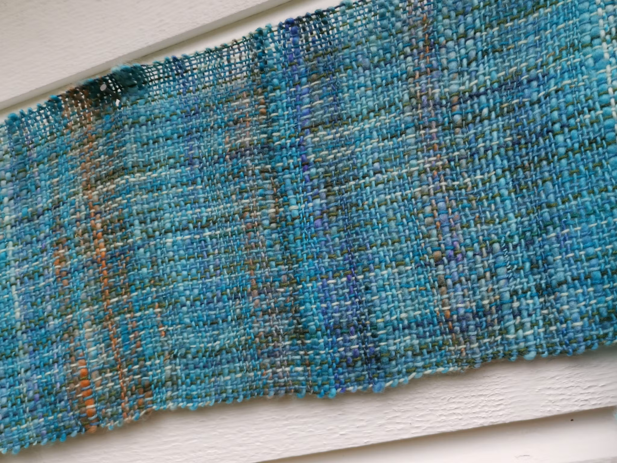Langt skjerf i flotte blåfarger. Renningsgarnet er superwash sokkegarn med ull og litt nylon, innslagsgarnet er tykt, entråds håndspunnet strukturgarn i superwashbehandlet merinoull. Unikt skjerf med spennende struktur og farger. Varmt og god, og ikke minst mykt.
