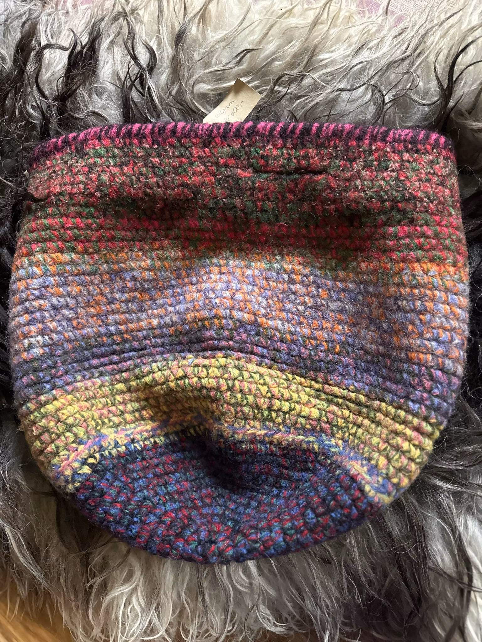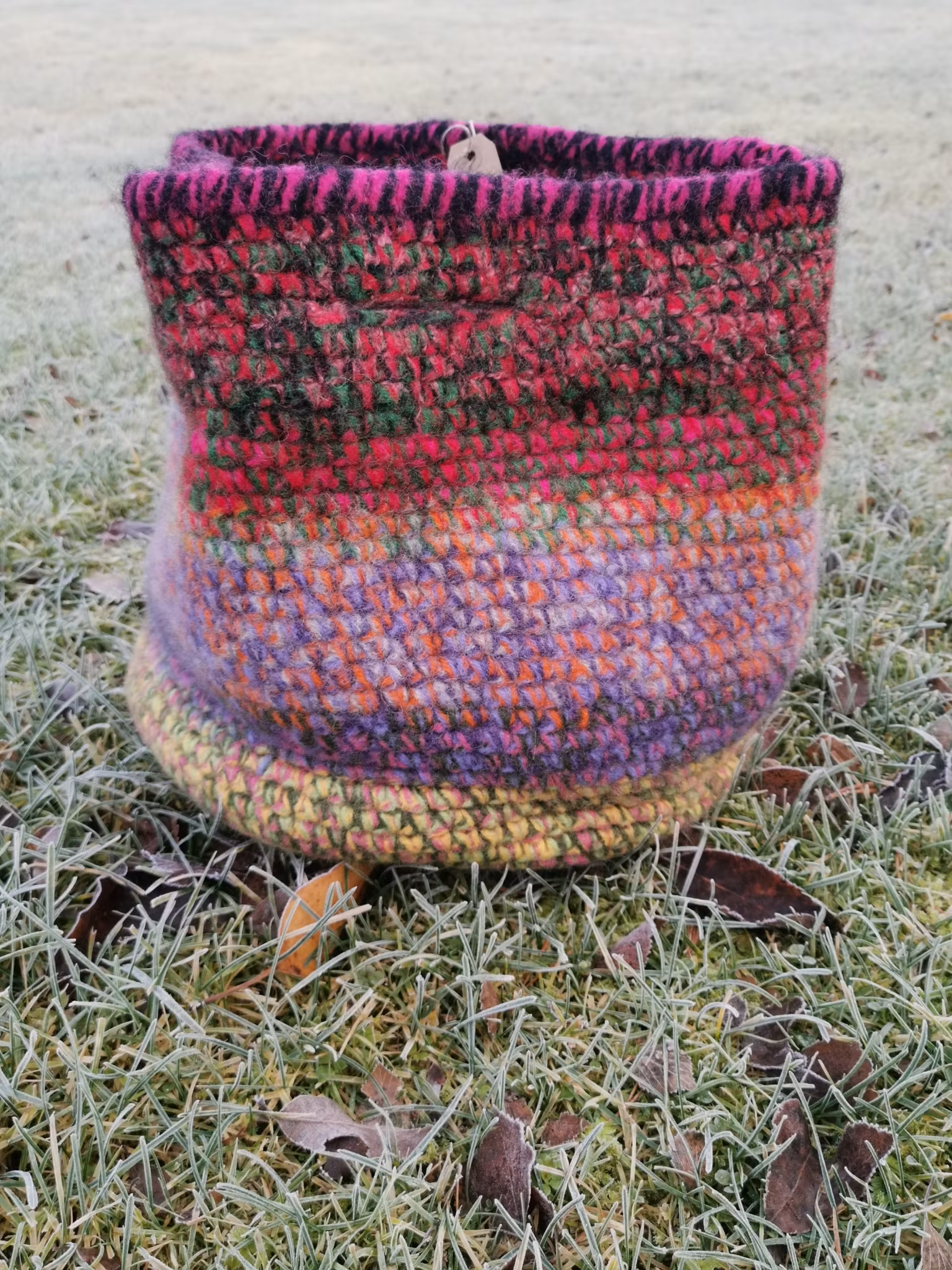 Stor kurv heklet av restegarn i ren ull og tovet. Denne er tykk og solid, og tåler både mye vekt om du bruker den til handlenett, ellers passer den perfekt som strikkekurv med plass til flere prosjekter i.